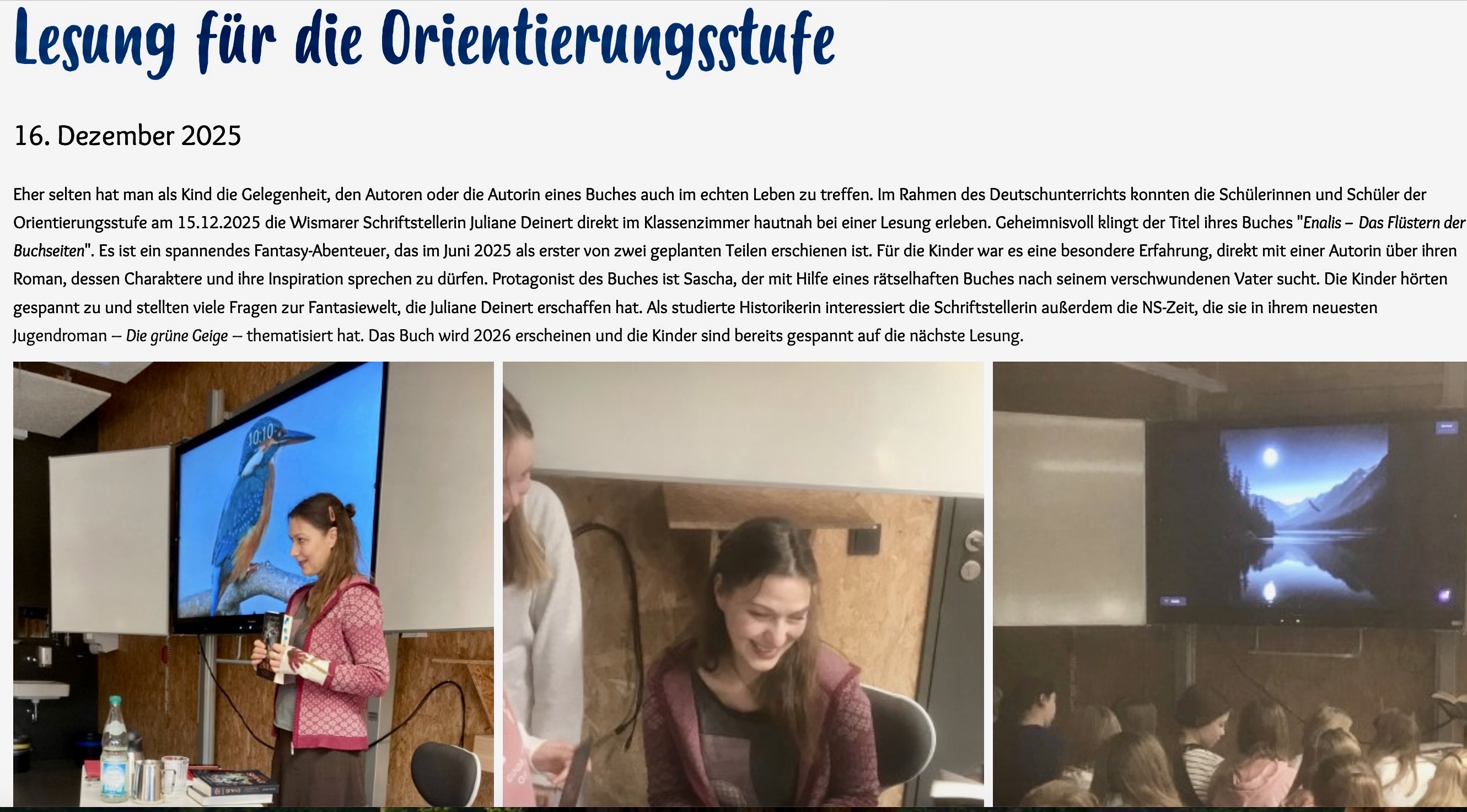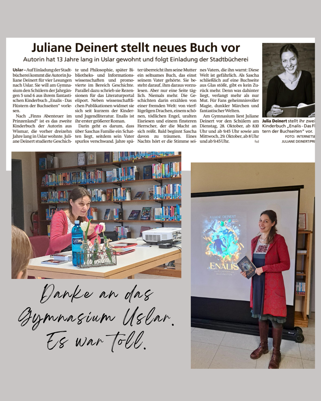 Sechs Klassen des Gymnasiums Uslar haben mir zugehört, tolle Fragen gestellt und große Begeisterung gezeigt. Es hat mir unglaublich viel Spaß gemacht, dort zu lesen – ein herzliches Dankeschön an die Lehrkräfte für die Organisation und an die Stadtbücherei Uslar für die Unterstützung!